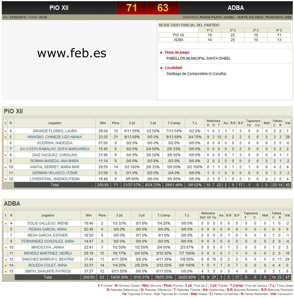 CB Pío XII, 57 (7+14+11+25): Laura Grande (13), Chineze Nwagbo (3), Mar Xantal (8), Itziar Germán (8), Baendu Lowenthal (13) -cinco inicial-, Nadezda Kudrina (0), Sofía Ramalho (5), Carolina Díaz (5) y Ana Román (2). Entrenador: José Ángel Rivera "Mozan".